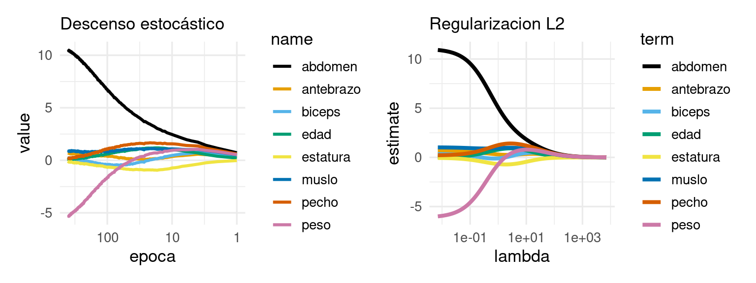library(keras3)x_grasa <- grasa_receta |>prep() |>juice() |>select(abdomen, edad, antebrazo, biceps, estatura, muslo, pecho, peso) |>as.matrix()vars_nombres <-colnames(x_grasa)y_grasa <- grasa_receta |>prep() |>juice() |>pull(grasacorp)## keras tiene distintos algos de optimizaciónmodelo_reg <-keras_model_sequential() |>layer_dense(units =1, kernel_initializer =initializer_constant(0))modelo_reg |>compile(loss ="mse",optimizer =optimizer_sgd(learning_rate =0.01))# esto es más eficiente hacerlo con callbacks en general:pesos_tbl <-map_dfr(1:400, function(epoca){ modelo_reg |>fit(x = x_grasa, y = y_grasa,epochs =1, verbose =FALSE) pesos_tbl <-get_weights(modelo_reg)[[1]] |>t() |>as_tibble() names(pesos_tbl) <- vars_nombres pesos_tbl |>mutate(epoca = epoca) })