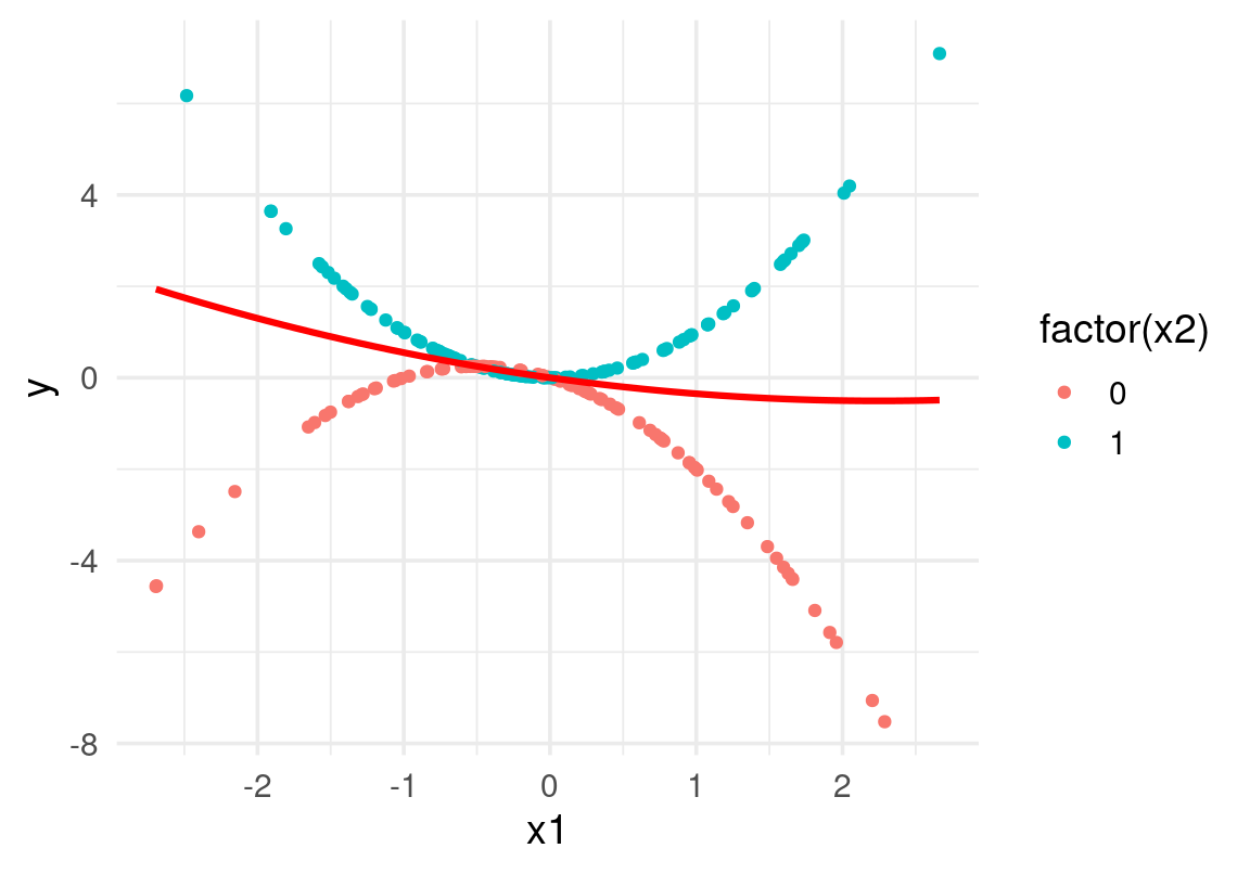 Ahora supongamos que usamos la variable \(x_1\). En este caso, podríamos calcular una predicción promediando sobre la variable \(x_2\), que no tenemos disponible: