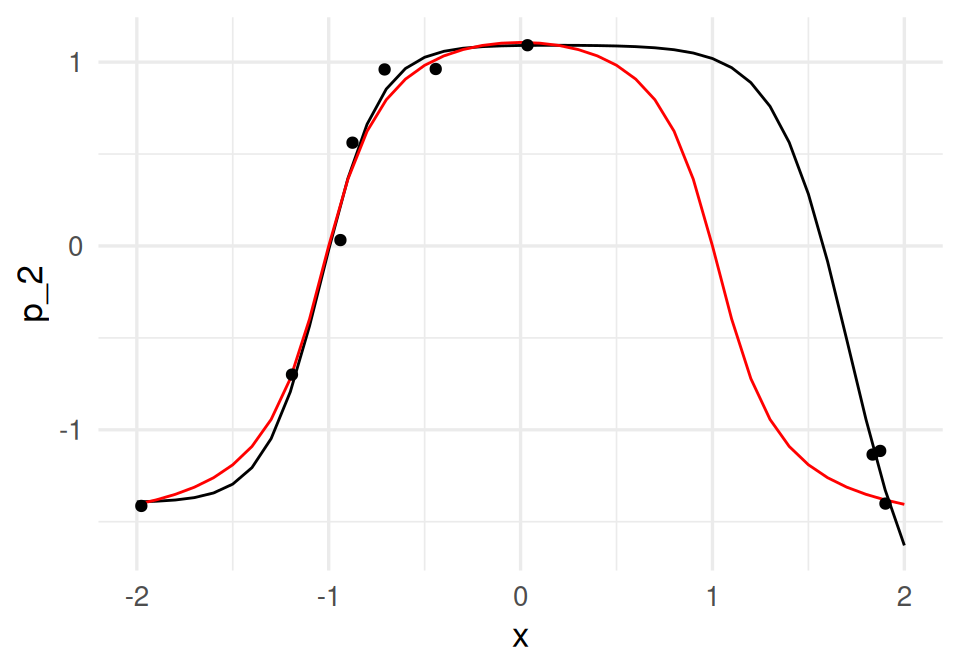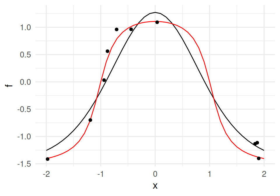 geom_line(data=dat_f, aes(x=x,y=f), col='red') +