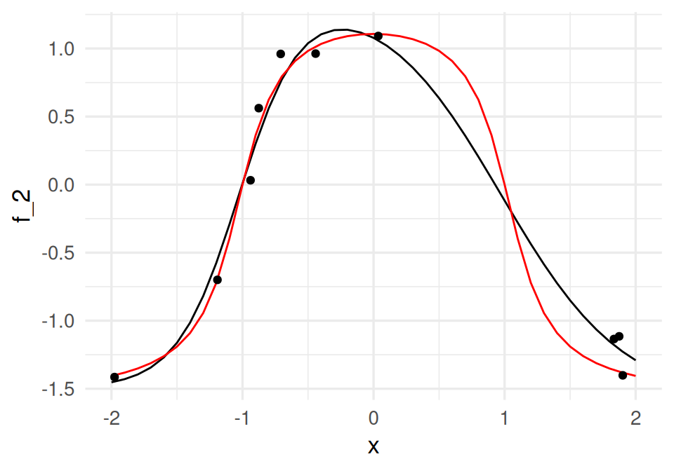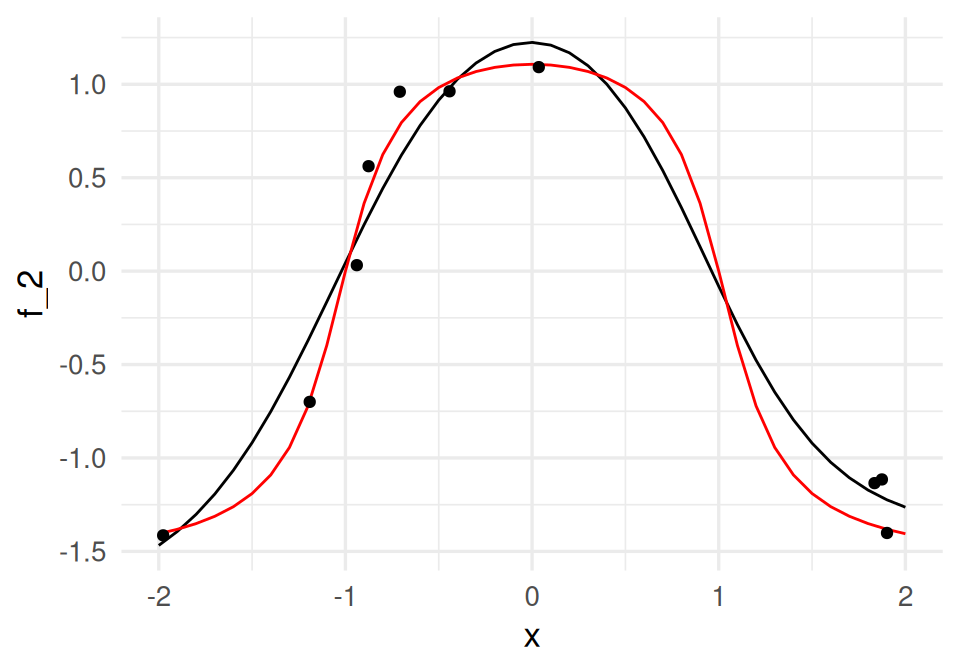 geom_line(data = dat_f, aes(x = x, y = f), col='red') +
