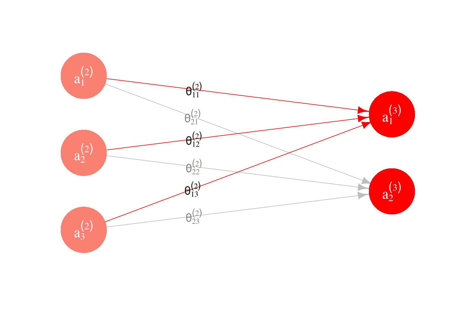 - Calculamos \(\delta^{(L)}=a^{(L)}-y^{(i)}\), y luego \(\delta^{(L-1)},\ldots, \delta^{(2)}\) según la recursión (Ecuación 6.4).