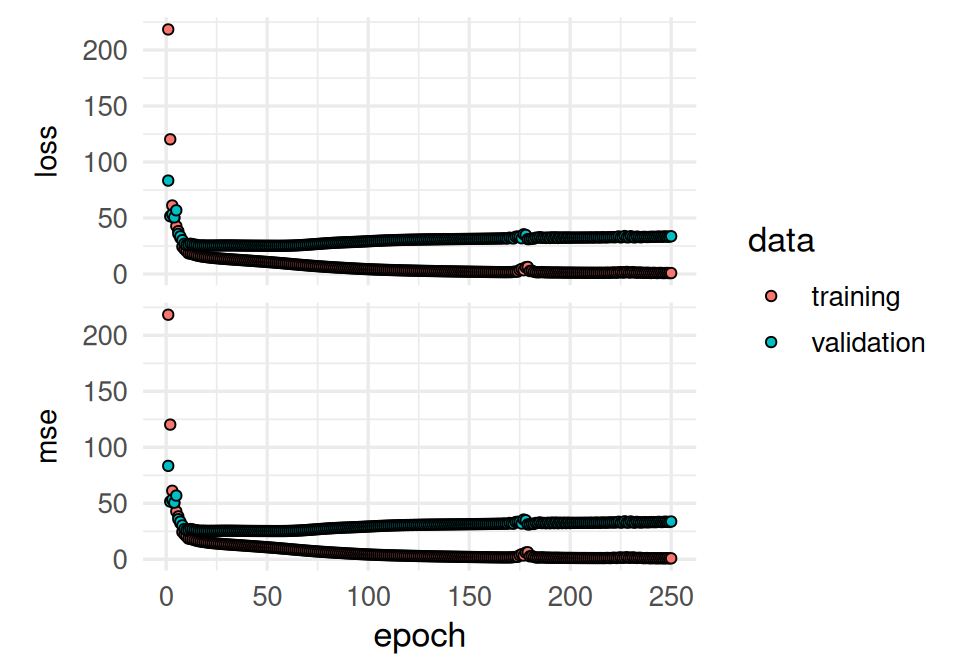batch_size = 30, epochs = 250, verbose = 0)Vemos que con esta red podemos alcanzar un error de entrenamiento cercano a cero, aún cuando vemos que sobreajusta al evaluar con la muestra de validación.