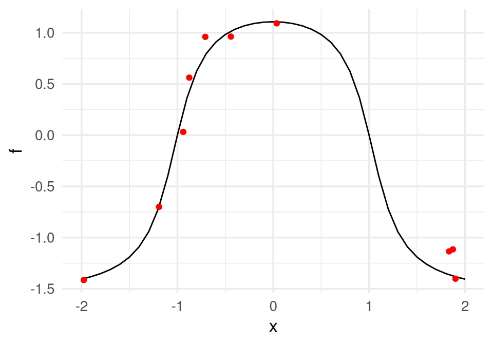 y <- rnorm(10, atan(2 - 2 * x_1^2), 0.2)