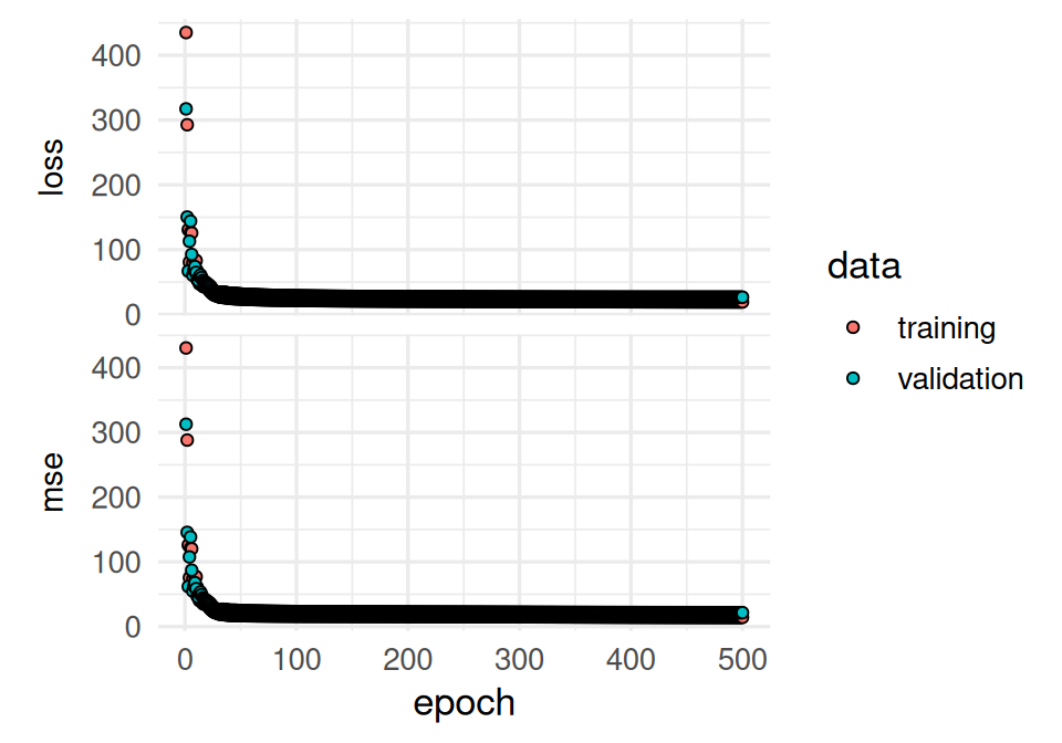batch_size = 30, epochs = 500, verbose = 0)plot(historia, smooth = FALSE)