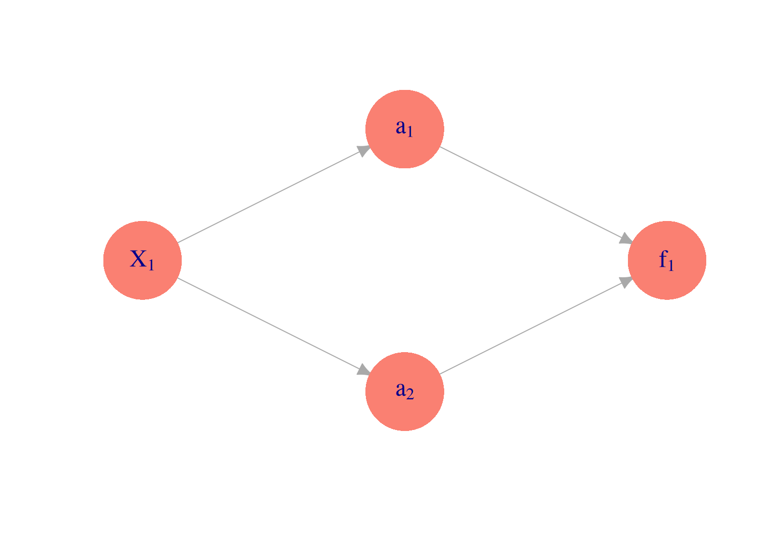 Podemos representar este esquema con una red dirigida (\(m=3\) variables derivadas):