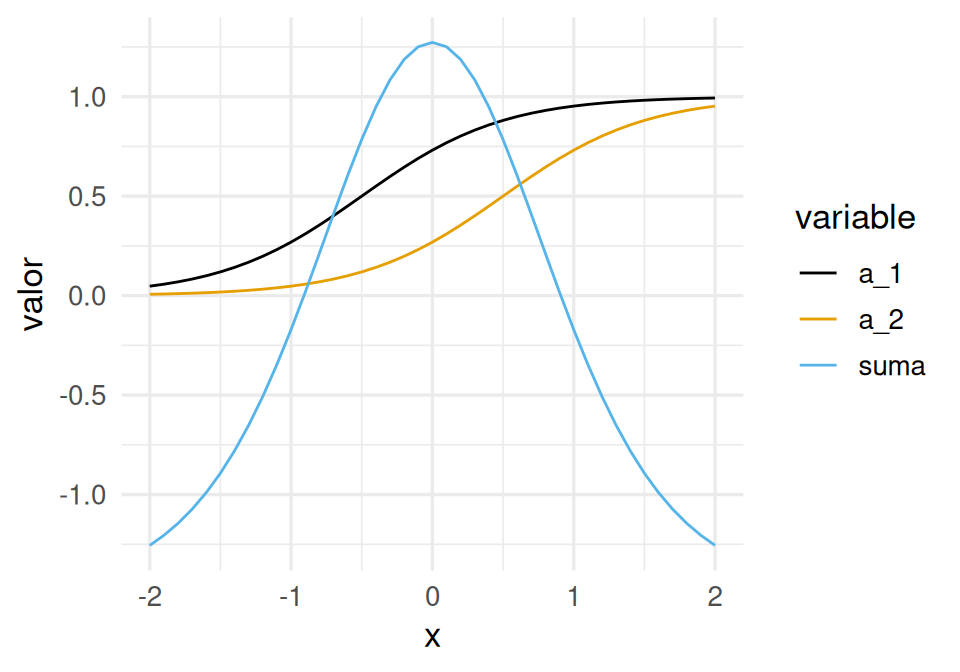 a_2 <- h(-1 + 2 * x) # 2(x-1/2) # una es una versión desplazada de otra.Las funciones \(a_1\) y \(a_2\) dependen de \(x\) de la siguiente forma: