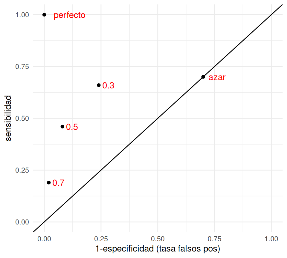 - Aunque podemos usar probabilidades y medidas como pérdida logística o score de Brier para ajustar y seleccionar modelos, como discutimos antes estas medidas pueden ser difíciles de intepretar para entender el desempeño de un predictor particular.