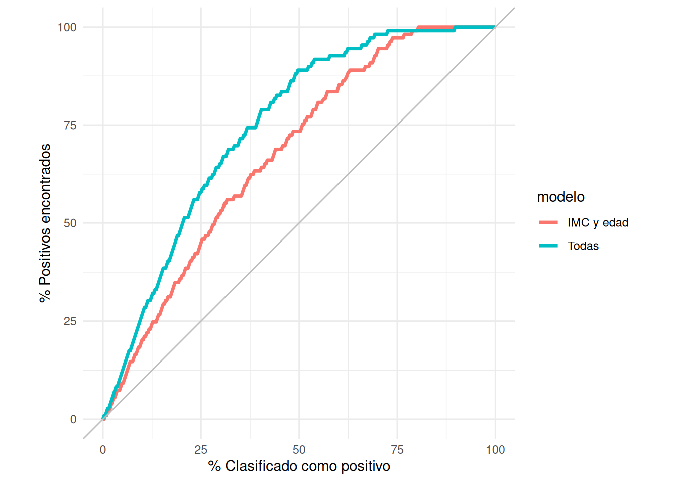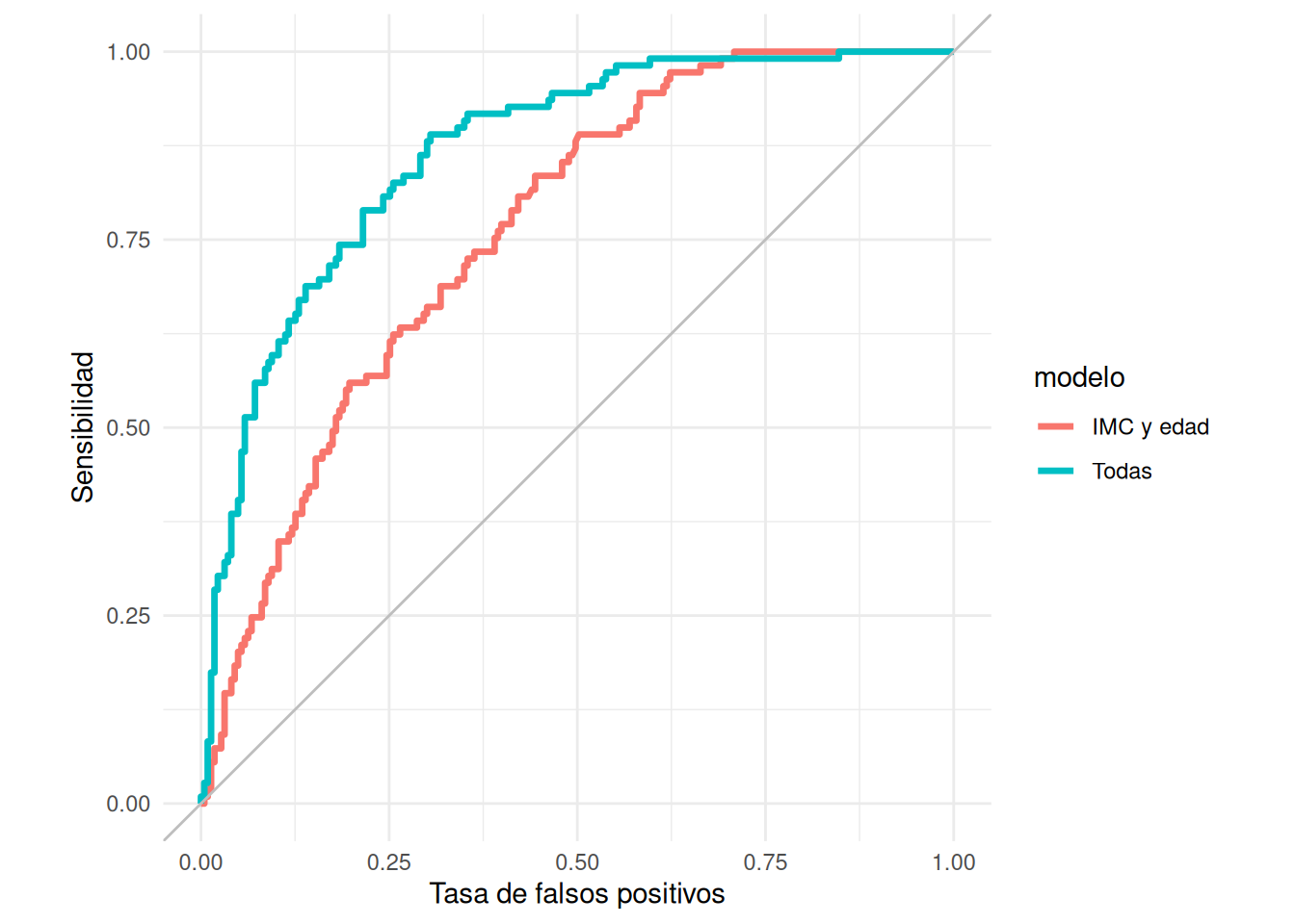 En este ejemplo, vemos que casi no importa qué perfil de especificidad y sensibilidad busquemos: el clasificador que usa todas las variables domina casi siempre al clasificador que sólo utiliza IMC y edad.