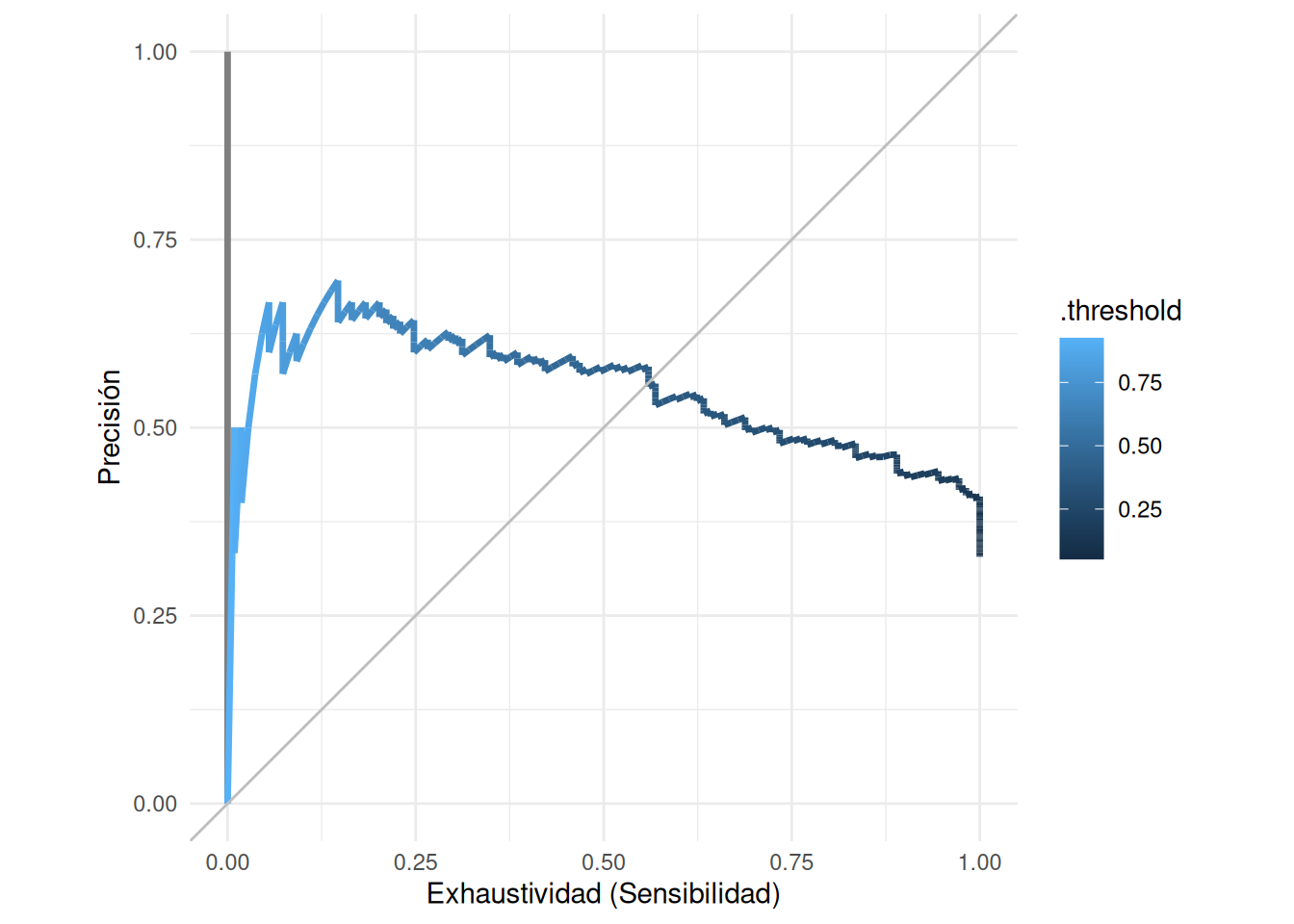 Nota que hay algunas oscilaciones en la curva. Cuando el punto de corte sube, la sensibilidad siempre baja o se queda igual (hay la misma cantidad o menos de verdaderos positivos). Sin embargo, la precisión se calcula sobre la base del número predicciones positivas, y esta cantidad siempre disminuye cuando el punto de corte aumenta. Especialmente cuando el número de predicciones positivas es chico, esto puede producir oscilaciones como las de la figura.
