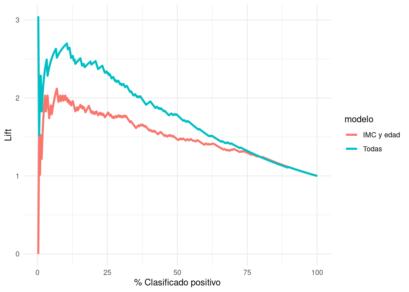Cuando el lift es más grande que uno, quiere decir que el modelo es superior en encontrar positivos que una estrategia de tomar casos al azar. Por las mismas razones que las curvas de precisión-exhaustividad, la gráfica puede ser ruidosa para puntos de corte altos.