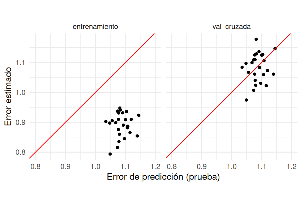 Observa los rangos de los ejes. Vemos que aunque los dos tipos de estimaciones están centradas en lugares similares, el error por validación cruzada es ligeramente pesimista (como esperábamos), y no está muy correlacionado con el error de prueba.
