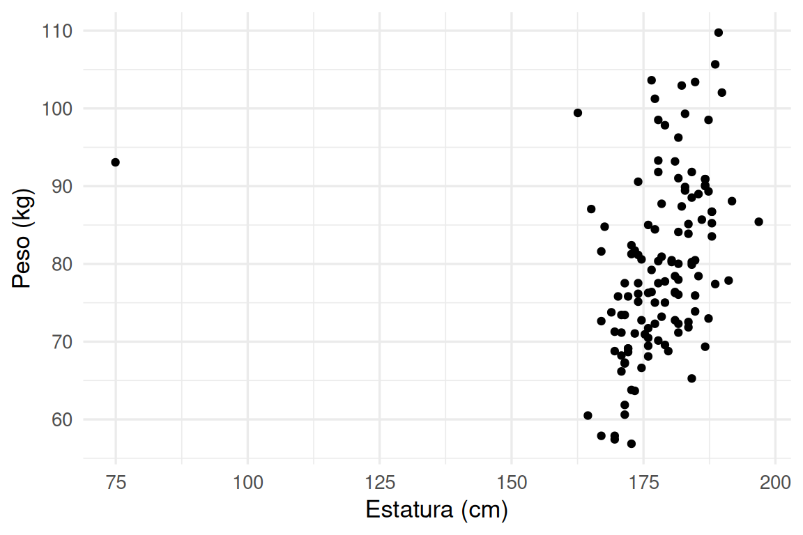 geom_point() + xlab("Estatura (cm)") + ylab("Peso (kg)")