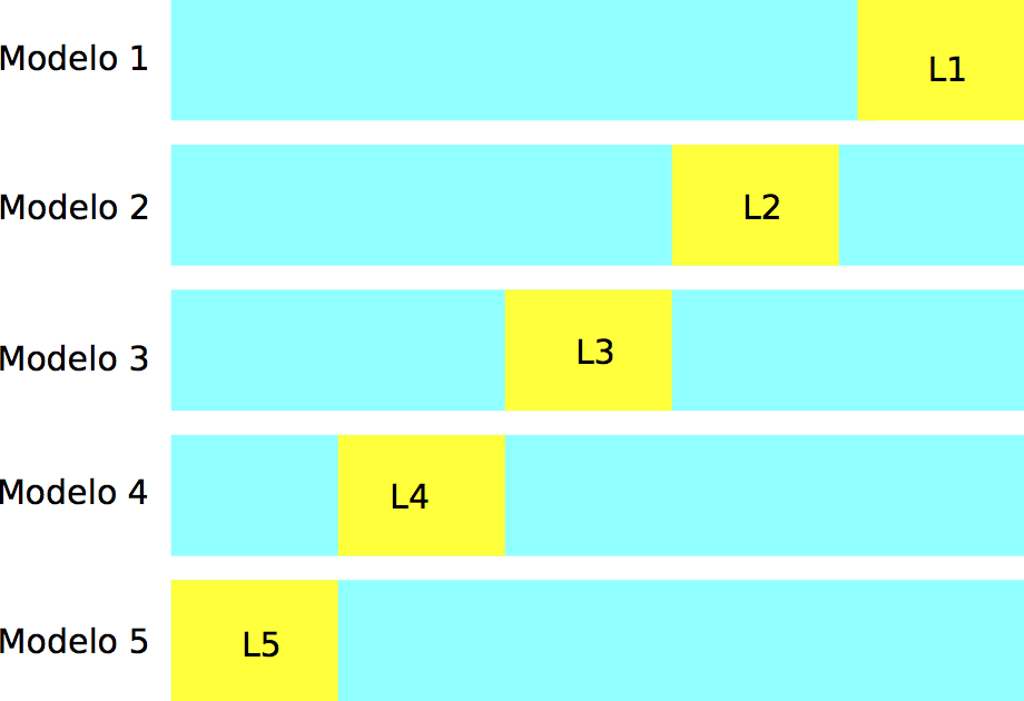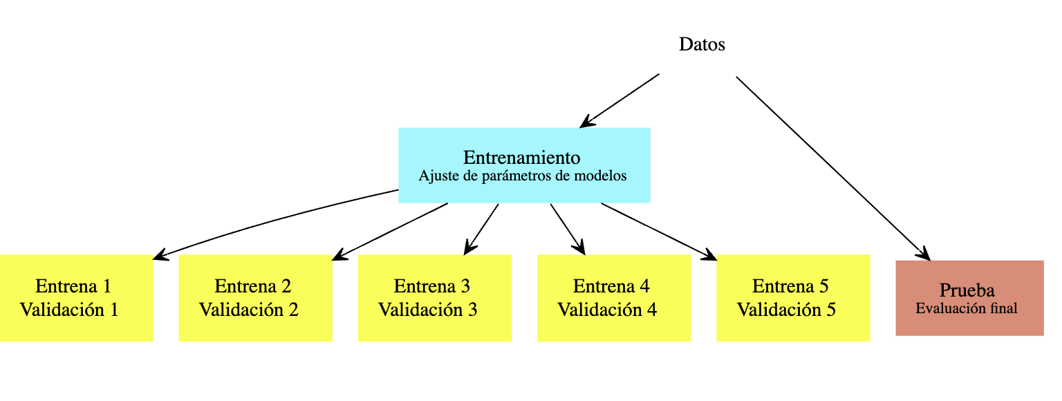Construimos \(k\) modelos distintos, digamos \(\hat{f}_j\), usando solamente la muestra \({\mathcal L}-{\mathcal L}_j\), para \(j=1,2,\ldots, k\). Cada uno de estos modelos lo evaluamos usando la parte que no usamos para entrenarlo, \({\mathcal L}_j\), para obtener una estimación honesta del error del modelo \(\hat{f}_k\), a la que denotamos por \(\hat{e}_j\).