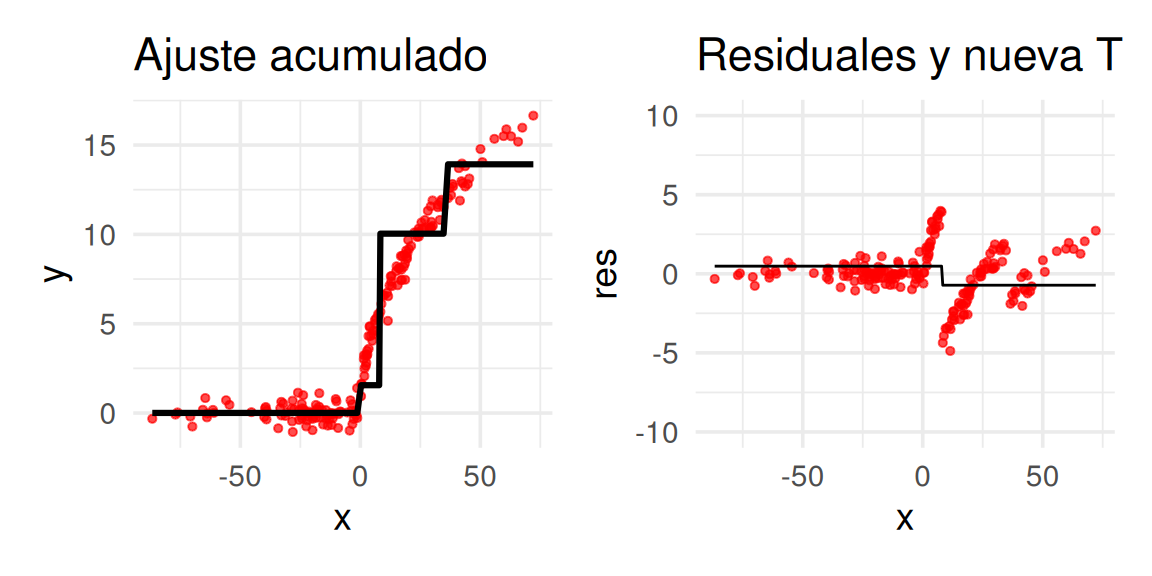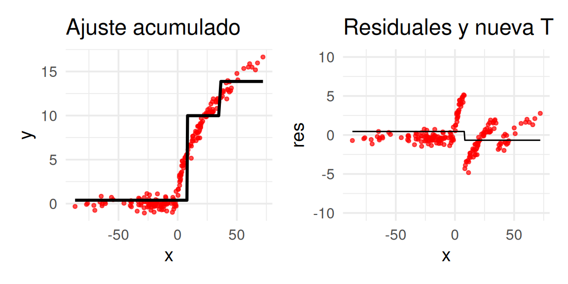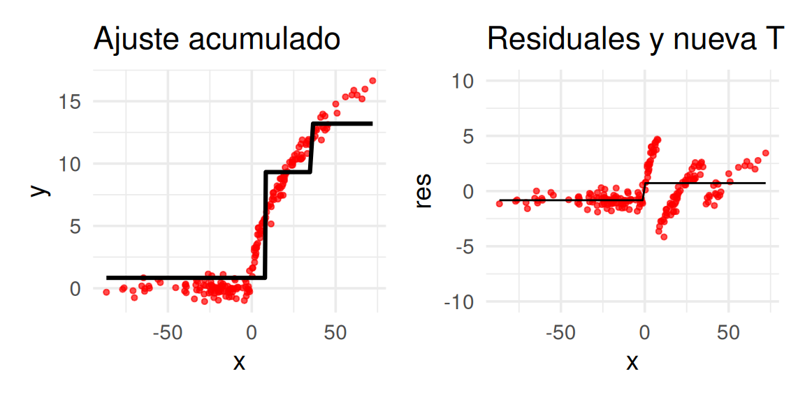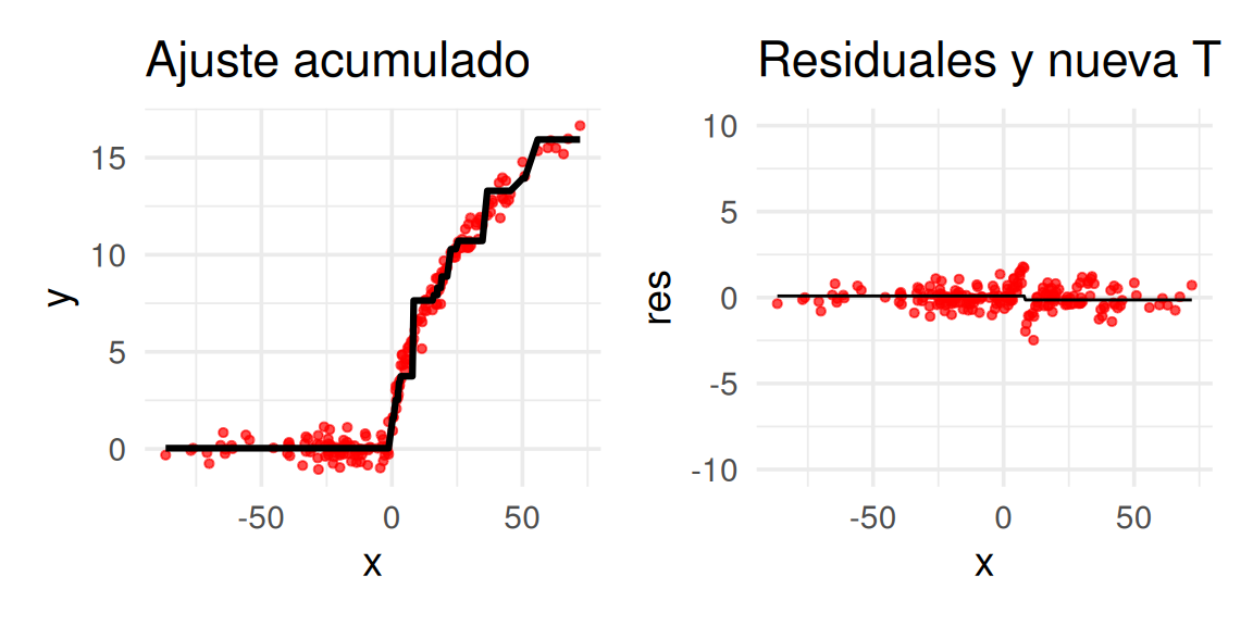 Este problema consiste en ajustar un árbol a los residuales o errores del paso anterior. Otra manera de decir esto es que añadimos un término adicional que intenta corregir los que el modelo anterior no pudo predecir bien. La idea es repetir este proceso para ir reduciendo los residuales, agregando un árbol a la vez.