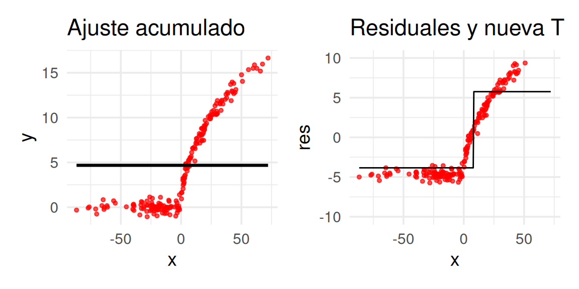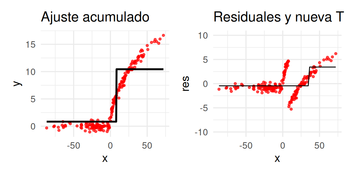 Si ponemos \[ r_{m-1}^{(i)} = y^{(i)} - f_{m-1}(x^{(i)}),\] que es el error para el caso \(i\) bajo el modelo \(f_{m-1}\), entonces reescribimos el problema anterior como \[\begin{equation} \min_{T} \sum_{i=1}^N ( r_{m-1}^{(i)} - T(x^{(i)}))^2 \end{equation}\]