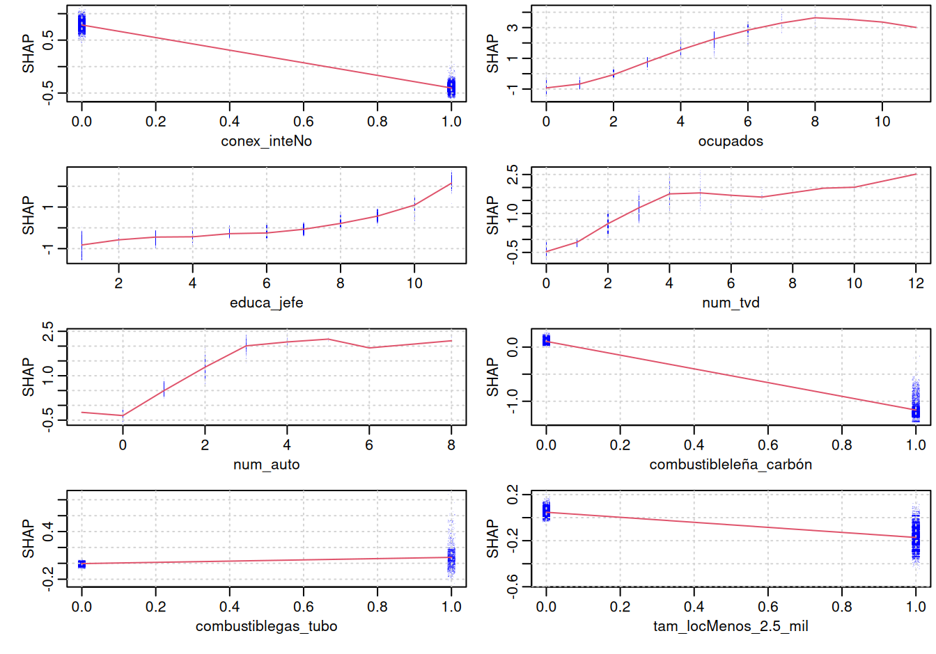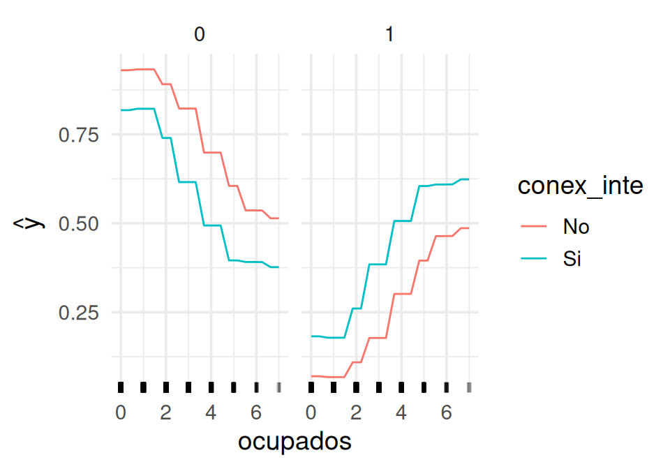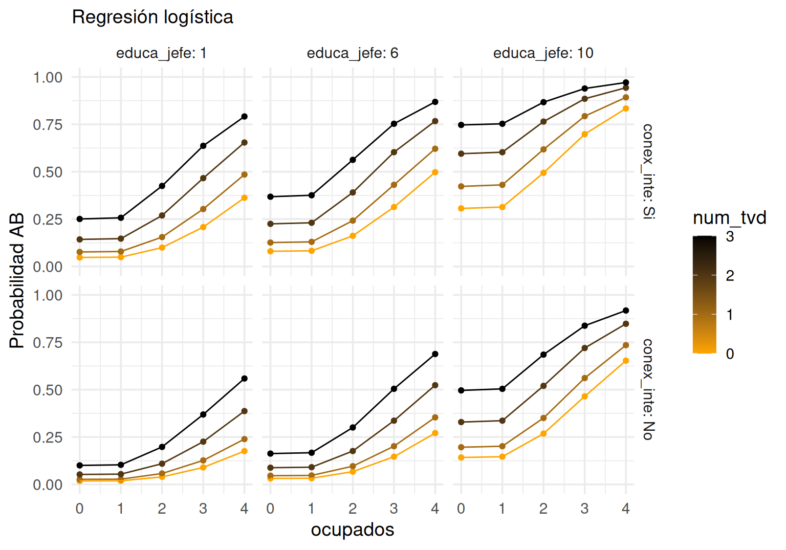 Para modelos con menos de unas 10 variables, también podemos fijar algunas variables en valores que nos interesen, y variar las restantes. En el siguiente ejemplo, fijamos localidades urbanas con mas de 100 mil habitantes que cocinan con gas en tanque (que es la mayoría):