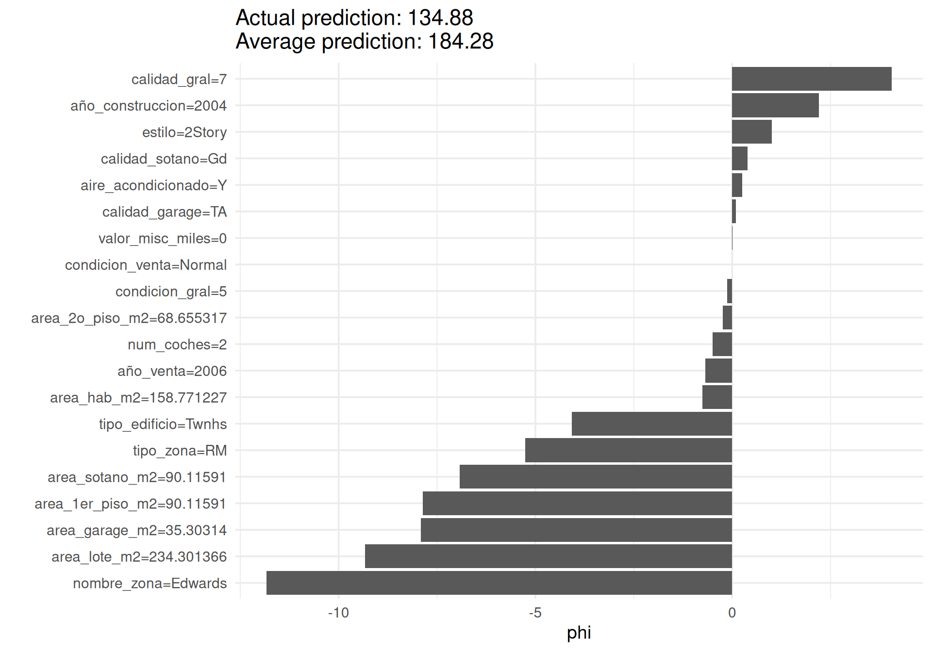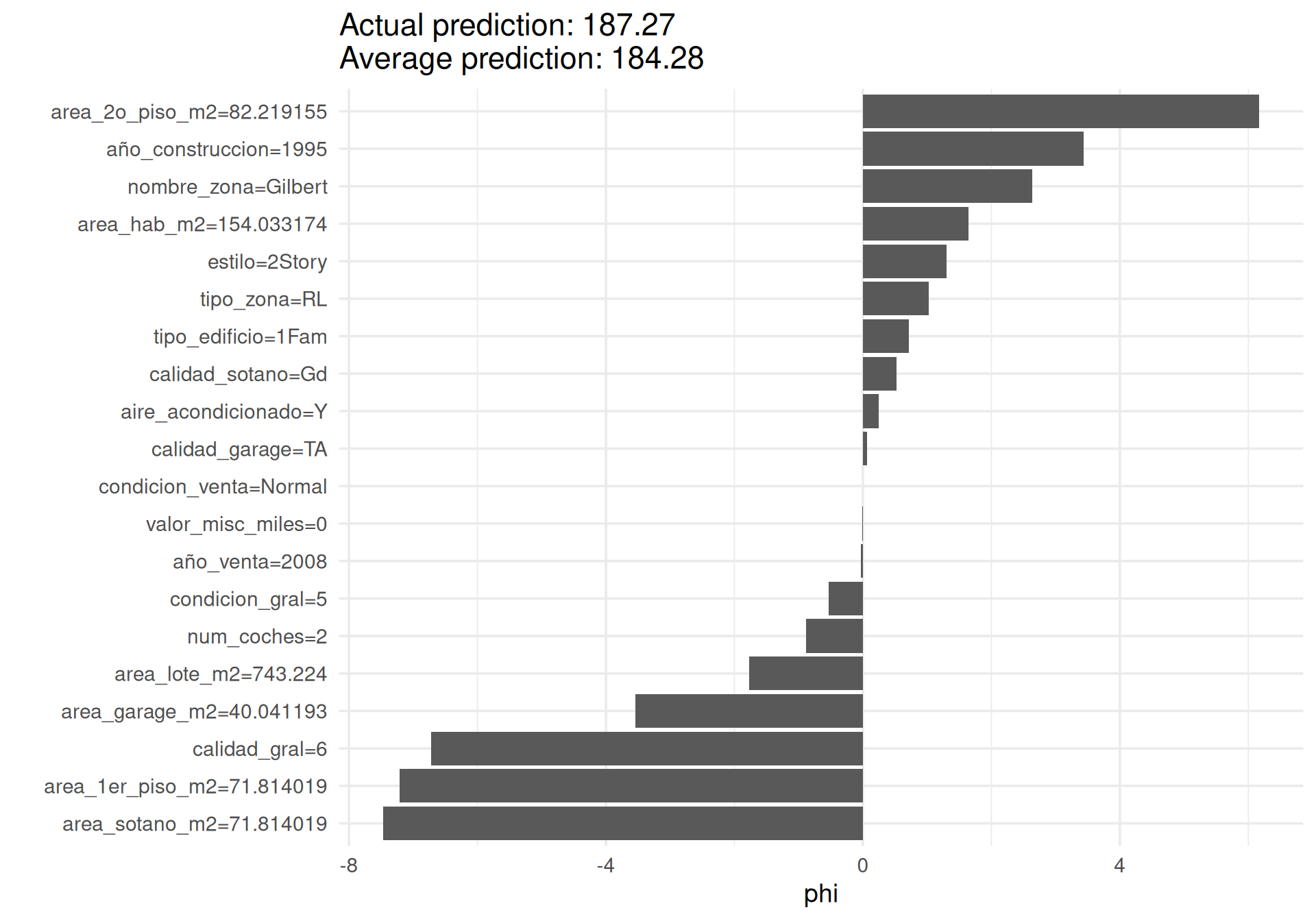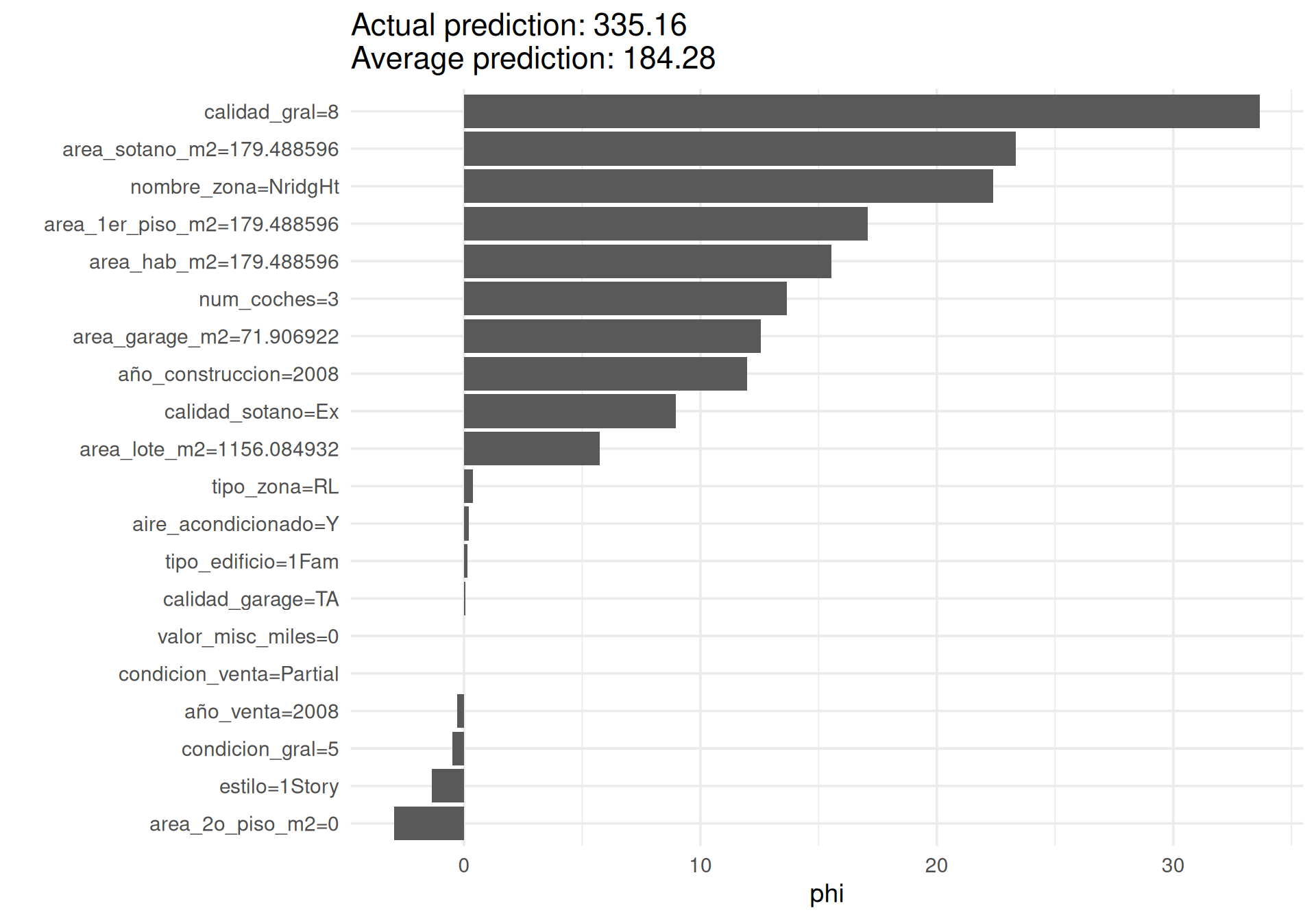 La suma de los valores phi da (aproximadamente, por el algoritmo usado) la diferencia entre nuestra predicción para esta instancia y la predicción promedio: