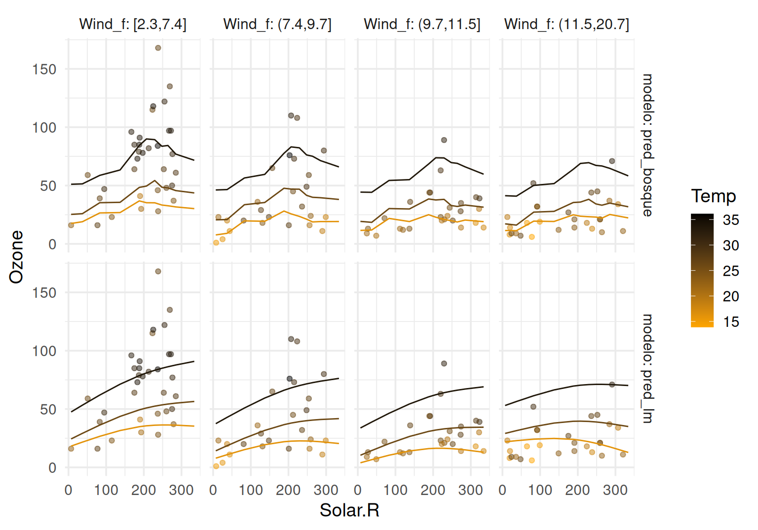 Consideramos construir un predictor (modelo lineal con interacciones y bosque aleatorio) de niveles de Ozono en términos de radiación solar, velocidad del viento y temperatura: