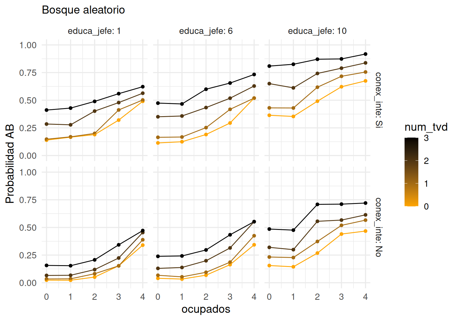 Nótese que algunas combinaciones tienen muy poca probabilidad de ocurrir (por ejemplo, aquellos con 3 teles digitales sin conexión a internet), sin embargo, estas gráficas nos dan una idea de cómo cambia la predicción respecto a algunas variables.