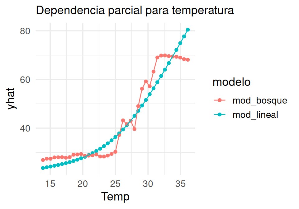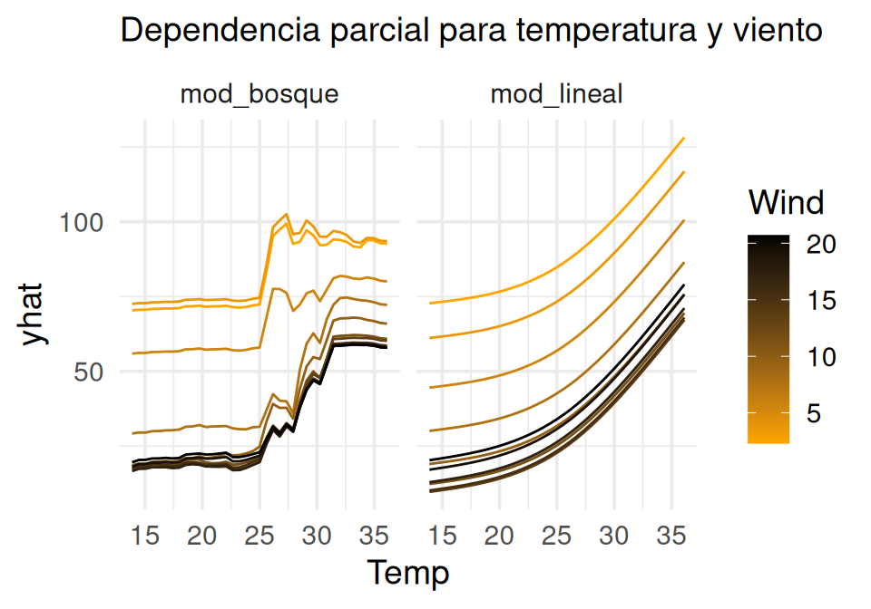 Una desventaja de esta técnica ocurre cuando tenemos más de unas cuantas variables de entrada. En esos casos, no es tan práctico fijar las variables que no son de interés en valores dados, y las gráficas de dependencia parcial pueden ser útiles (ver también Hastie, Tibshirani, y Friedman (2017)). Comenzamos con el caso de dos variables: