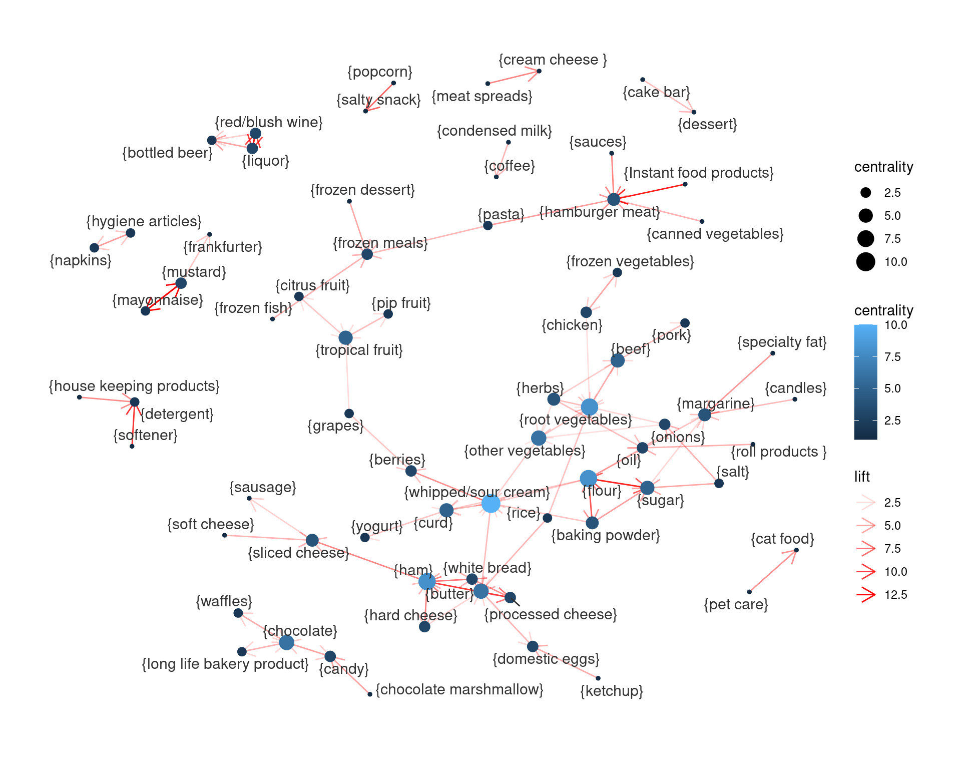 Tener una visión amplia del market basket analysis es difícil (típicamente, funciona mejor como un resultado al que se le hacen querys, o uno donde filtramos cuidadosamente algunas reglas que puedan ser útiles). Así que muchas veces ayuda visualizar los pares con asociación alta: